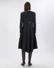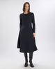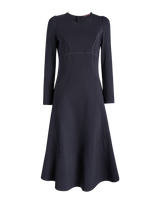 The Synchro dress is a minimalist everyday piece with a classic empire cut: the upper part is more fitted and defined by exposed seams, while the flared lower section adds a practical, modern touch. Crew neck. Long sleeves. Back zip closure. Side slit pockets. Exposed seams. Asymmetric hem.