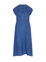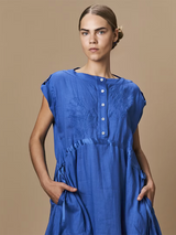 Very full square cut dress in cerulean blue ramie. Boat neckline faced in self-fabric on a short button placket fastened with mother-of-pearl buttons. Square cut body extends into grown-on cap sleeves held in place with a button and tab.