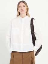 Defined by a boxy fit and a subtle gathered hem created by an adjustable drawstring, this essential shirt is elevated by a delicate eyelet embroidery at the bottom. Mandarin collar. Front button closure. Double flap pockets on the chest. Long sleeves with buttoned cuffs. Drawstring hem. Embroidered hem. Swarovski® crystal on the back.