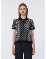 Polo shirt made from exquisite pure wool yarn in jacquard tubular knit with an all-over geometric design. The collar is in solid knit, and the front opening features matching mother-of-pearl buttons. Cuffs and bottom hem finished with ribbing.