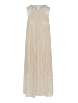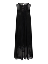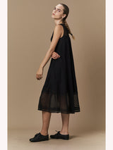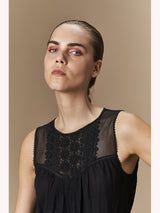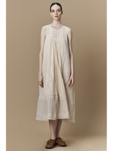 Sleeveless dress in cotton tulle and lace with a round neckline fastened at centre back with a loop and button over a keyhole opening. Neckline and armholes are finished with a mini scalloped edge. Front has a V-shape yoke decorated with bands of lace over gathering creating volume down the full flared bodice and skirt.