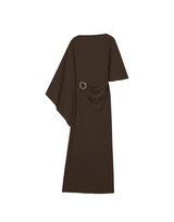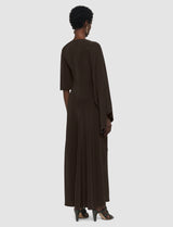 The Joya Satin Twill Dress is a fit to flare silhouette, crafted from a smooth viscose-blend fabric. Soft pleating and draped detailing, secured with a waistline pin, enhance the figure. A slash neckline and asymmetric sleeves complete the look with understated elegance.