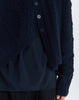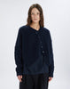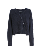 The Intervene cardigan blends an asymmetric silhouette with a mix of ribbed and cable-knit patterns, punctuated by openwork details that create a dynamic patchwork effect. The diagonal button closure across the front adds a distinctive finishing touch. V-neck. Slightly dropped shoulders and long sleeves with ribbed cuffs. Cable and ribbed knit patterns. Asymmetric ribbed hem. Back slit. Swarovski® crystal on the back.