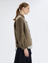 The Styx caban transforms effortlessly into a bomber-style jacket. Its defining feature is a concealed pleat at the back with hidden snap buttons, allowing the silhouette to shift from tailored to casually relaxed. Made from wool, cashmere, and nylon, it is soft, comfortable, and contemporary. Stand collar. Double-breasted front closure. Two side welt pockets. Dropped armholes. Buttoned cuffs. Exposed topstitching. Back pleats with hidden snap buttons. Swarovski® crystal on the back.