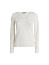 The Droll sweater features a refined openwork design that alternates net-like textures and geometric motifs, enhancing the silhouette with lightness and balance. V-neckline with ribbed trim. Long sleeves with ribbed cuffs. Openwork knit. Straight ribbed hem. • Wool blend, lightweight, soft handfeel.