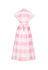 Edrina 90 Midi cap-sleeve button-down shirtdress with full skirt in silk-cotton gingham voile, colour white and pink. Belt in own fabric included.