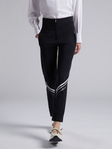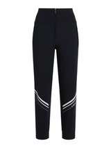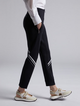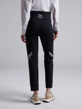 High waistband. Front zip closure. Side pockets with zip closure. Seam detailing. Contrasting white stripes on the knee. Logo patch on the back.