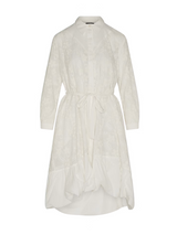 Shirtwaist dress in cotton and floral embroidered voile. Turn-down collar on front fastened with mother-of-pearl buttons under a neck to hem fly placket. Front has a triangular bib insert trimmed with braid over a full body in voile with volume created by panels at the side.