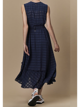 Sleeveless shirtwaist dress in semi-sheer tech chiffon seersucker. Neckline and armholes bound in self-fabric. Button-thru front fastened with mother-of-pearl buttons.