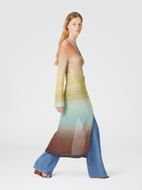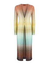 A piece with a sophisticated and modern spirit, this long cardigan in viscose and lamé is characterized by a V-neck, central button closure, and a wide opening at the lower front, giving movement and lightness to the silhouette.