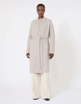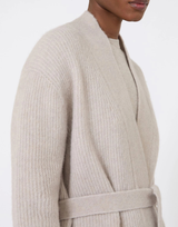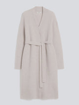 Long V-neck cardigan in a high-quality blend of alpaca and wool. Straight-cut model with long sleeves and a low neckline. This yarn gives the garment a slightly puffy appearance, making it comfortable to wear. The front is made from solid knit fabric. The garment is fully made in English rib stitch.