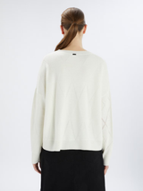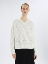 The Astrid sweater is defined by a classic diamond motif, created through a combination of openwork and topstitching. The geometric design is enhanced by the interplay of raised and flat sections, resulting in a tone-on-tone, eclectic texture.