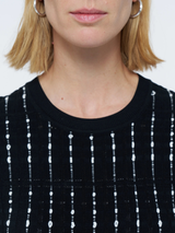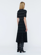 The Fragmented Stripes Dress is a fit to flare dress, crafted from a viscose blend. This elegant piece features a contrasting dotted, stripe pattern. Its compact, ribbed knit design provides a flattering weight and drape.