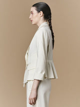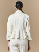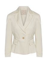 RRP: $1,785Short fitted jacket in ivory nylon and viscose jersey with a notched collar and revers with edges in ivory cupro on a single breasted front fastened with one ‘horn’ button. Shape is created with a diagonal fit seam and a curved body panel and the waist is defined by an inset band of cupro. Two horizontal welt pockets with a flaps edged in cupro. Slightly padded shoulders over inset sleeves with bands of cupro around and cuff. Reverse has a stitched through facing and fit seams into the waist over a gently fluting back hem finished with grosgrain ribbon.