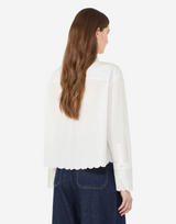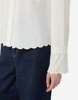 Scalloped broderie anglaise lace shirt collar and long cuffs + Mother-of-pearl button fastening
