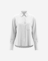 Patch breast pocket, Darted rear yoke and central pleat detail on the back w Scalloped-edge rounded hem