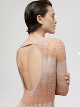 Embellished by the oval cut-out neckline on the back, the long dress is embellished with a Greek zigzag pattern and lit up by the flashes of lamé. The profiles of the garment continue the decorative motif, for a result of extreme refinement.