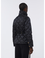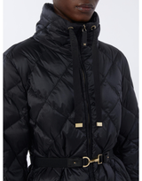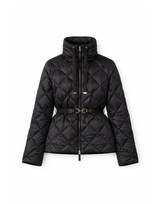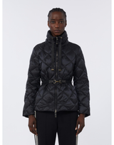 Short down jacket made from shimmering water-repellent fabric, padded with goose down. Featuring an all-over quilted diamond pattern. It has a drawstring collar with customised jacquard ribbons, side pockets, an internal drawstring at the back, and an elasticated waistband. Front fastening with a metal zip and double leather slider.